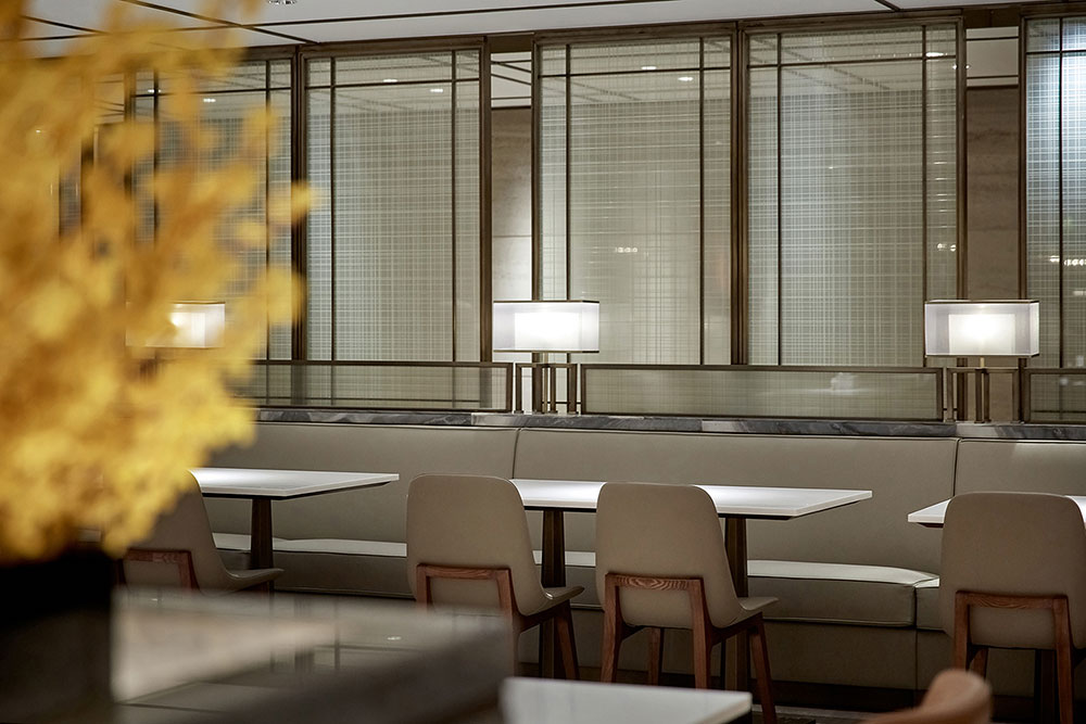借由線條色塊,朗昇以室內天花的高低錯落和立面的不同材質體塊作為隔斷完成對空間的限定,巧妙的將大堂、公共就餐區、包房、高管區進行了有效劃分,整體空間互相連結卻又彼此獨立。區域分隔和聯系的交替、高低錯落的變化,不僅彰顯空間關系的轉換,平衡了餐廳私密與開放的本質需求,也是對中國以倫理次序為依托的“禮”的最高致意。
