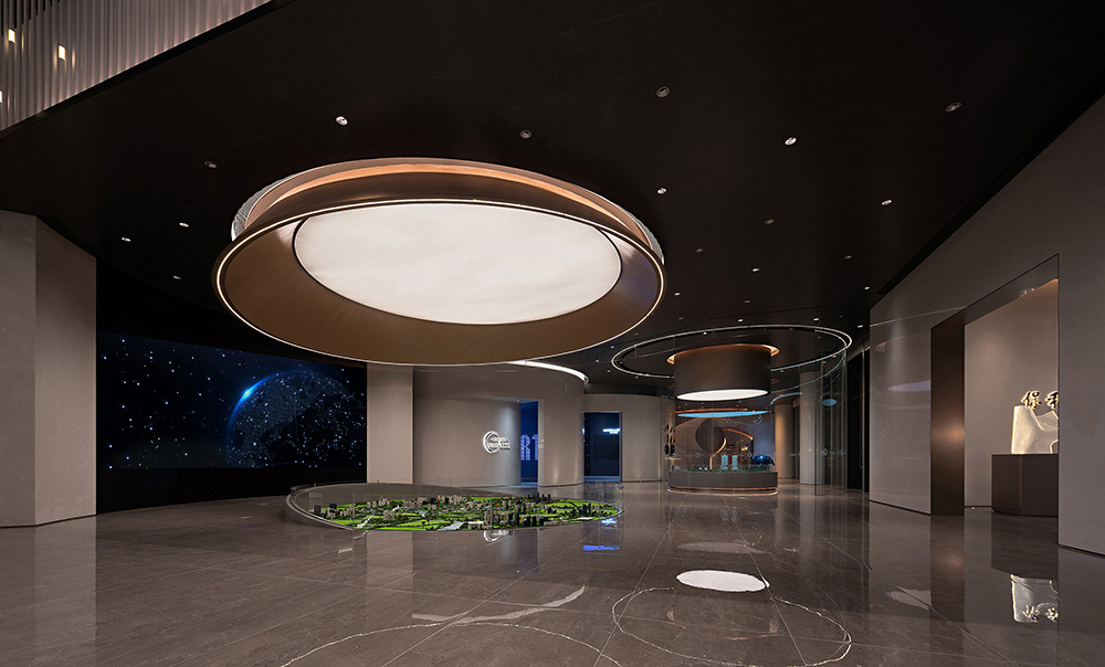 以點繪圓、思想延伸,是這個項目在理念和故事上的共性,基于手游、電競蔚藍科技的想象,室內團隊以星為象的宇宙空間概念引發建筑園林景觀設計的連續性思維,在未來科技主題中還原一個和諧共生的宇宙家園成為這片領域的共同夢想,室內展示空間是這片未來家園的縮影。