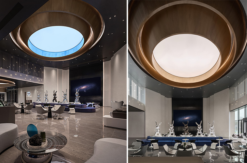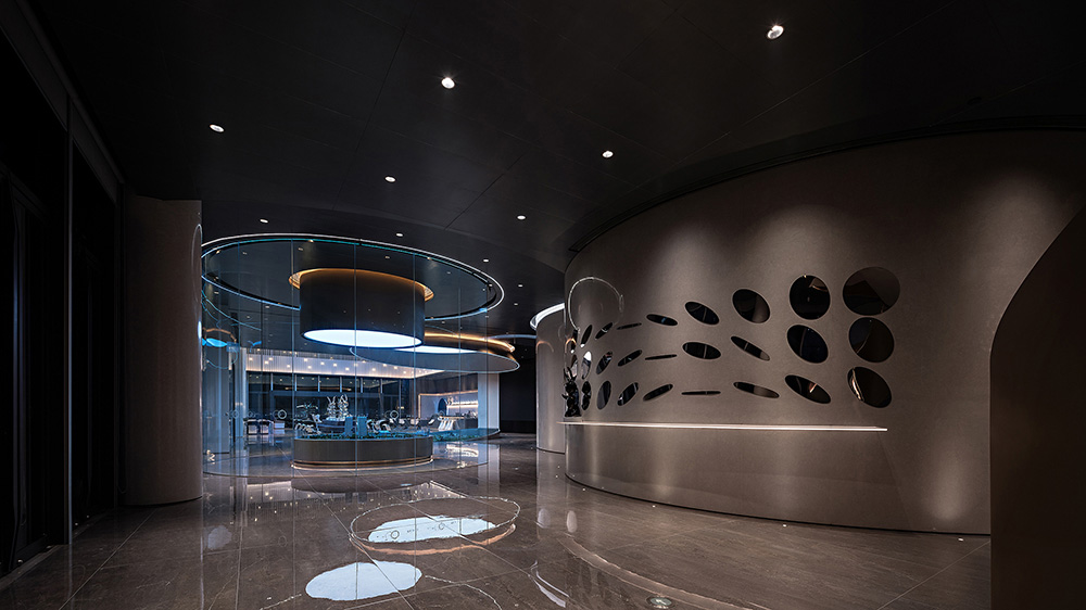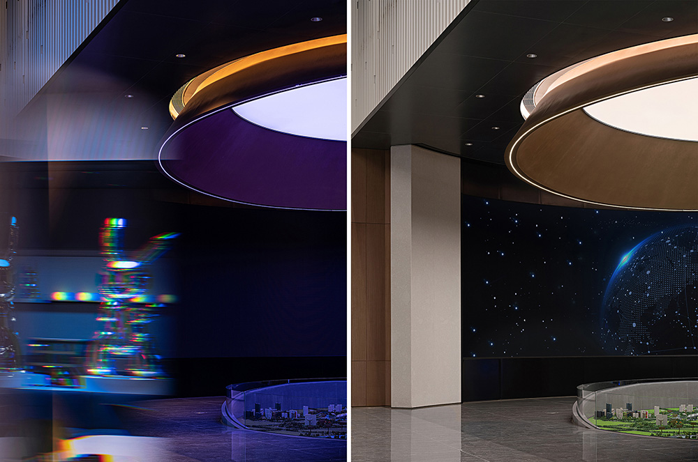 沙盤展示區取天地倒影、兩兩相望的星球對話、演藝空間解構天體運行的動態浮力球,空間頂面遠近交替的圓形裝飾與光源...每一個區域球體與球體之間能量的聚環虛化邊界的同時把空間無限放大,而球體與球體之間的直線關聯又像星系一樣折射出多維的空間畫面,行走在空間里,一面感受到無盡的生命、豐富的動力,一面體驗理性的秩序、圓滿的和諧,而這也是電競精神的價值所向。