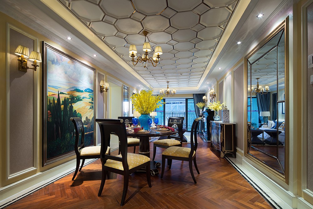 印花,是次臥設計的亮點。扎染藝術風格的軟包和床罩,繁花如簇,素雅簡凈,增添了幾許古樸自然的民族風情。雕花鏤空的藍色臺燈底座,琉璃著光陰,也絢爛著芳華,在光影流年中,堅守著質感的追求。鄉村田園風景畫則和餐廳的設計元素遙相呼應,將優美的自然風光引入室內,令人心曠神怡。