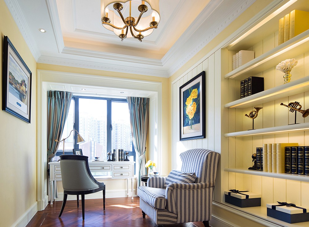 本套樣板房設計以歐式田園風格設計為主,與現代元素相結合,并輔以少量東方元素作為點綴,整體空間以藍、黃色作為色彩基調,使用優雅的黑、白色中和,浪漫的歐式經典藍、黃色絲質布藝與抽象紋樣地毯、掛畫、燈具相搭配,營造了精致細膩而又自由浪漫的空間格調,呈現出充滿自然氣息的田園風情。