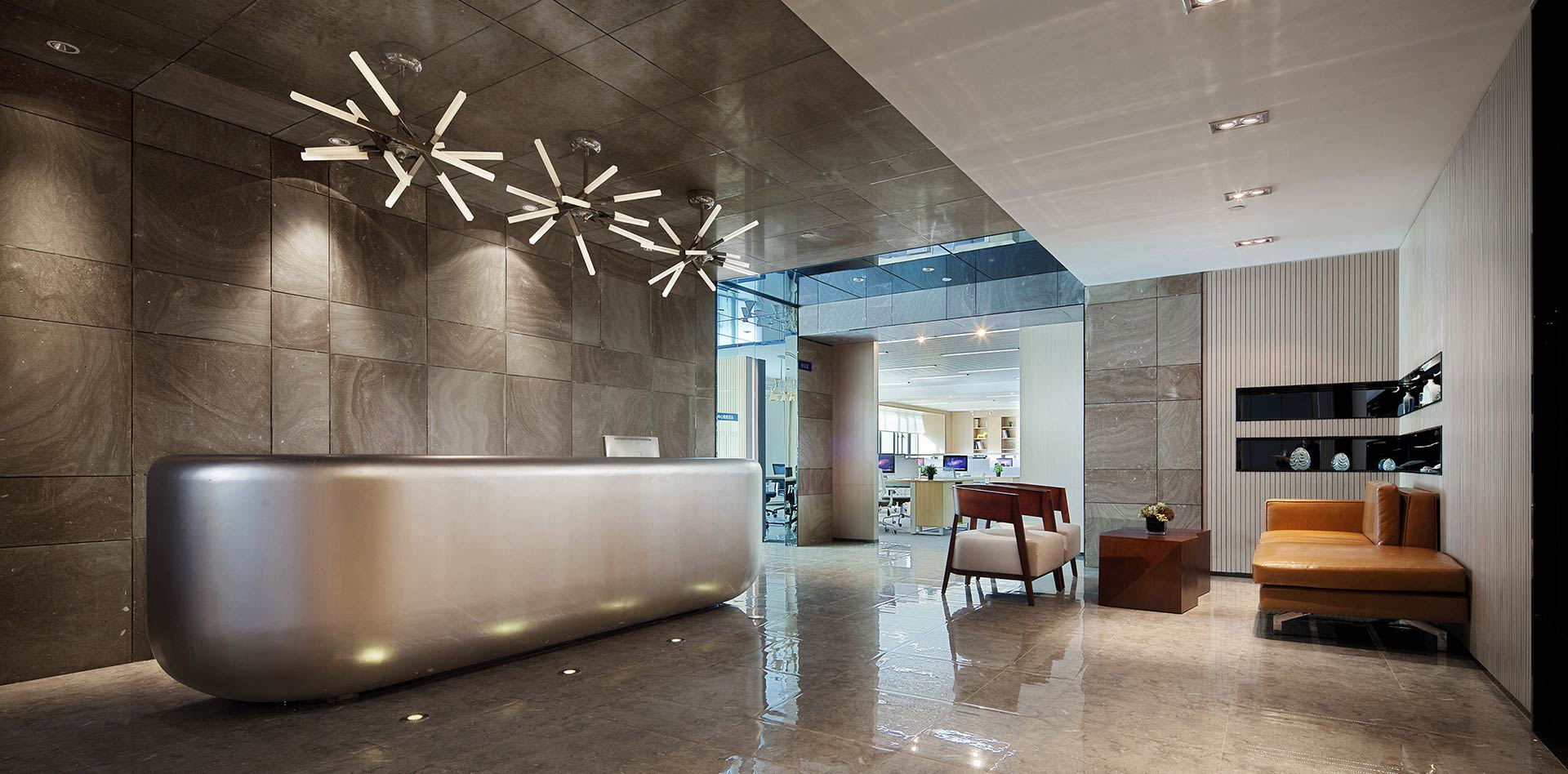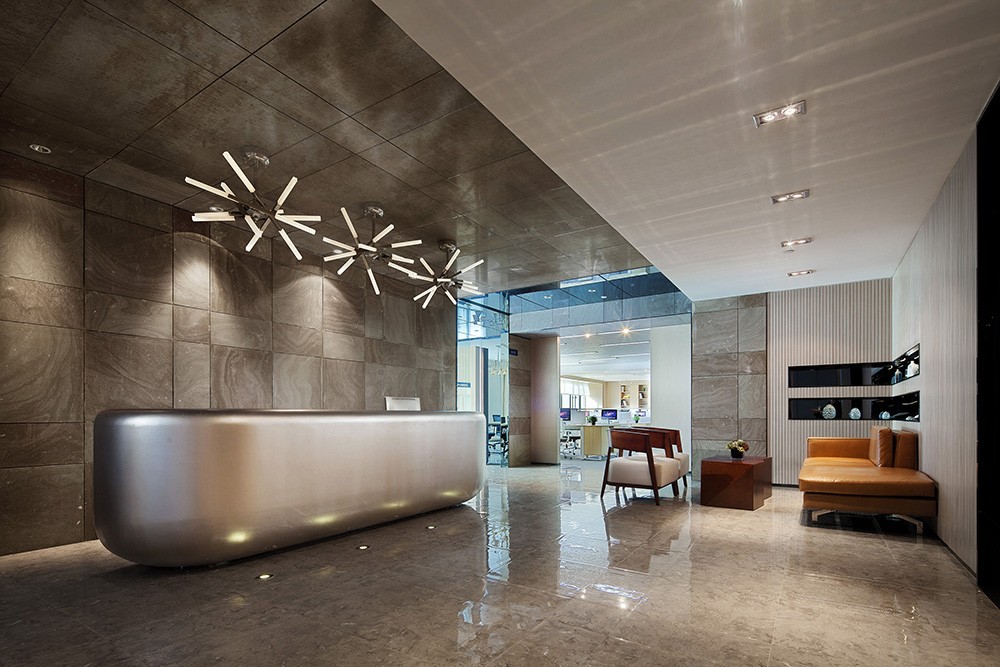 昆明海倫城市廣場寫字樓樣板房設計的前廳設有前臺區及洽談區。整個空間呈現出一種前衛的金屬質感美,銀灰色前臺在不規則燈具的照射下閃耀著金屬光澤,金屬色墻磚在光影的作用下,顯現出獨特的紋理,順著背景墻一直延伸到天花,增強了空間的立體感,個性且神秘。白色從另一面墻延伸而上,與金屬灰“共享空間”,灰與白的對比,豐富了層次,使整個空間極具現代感與科技感。