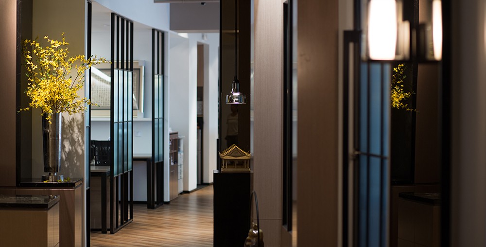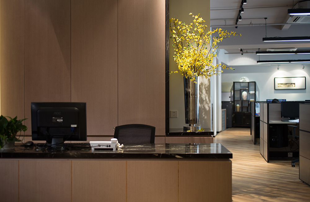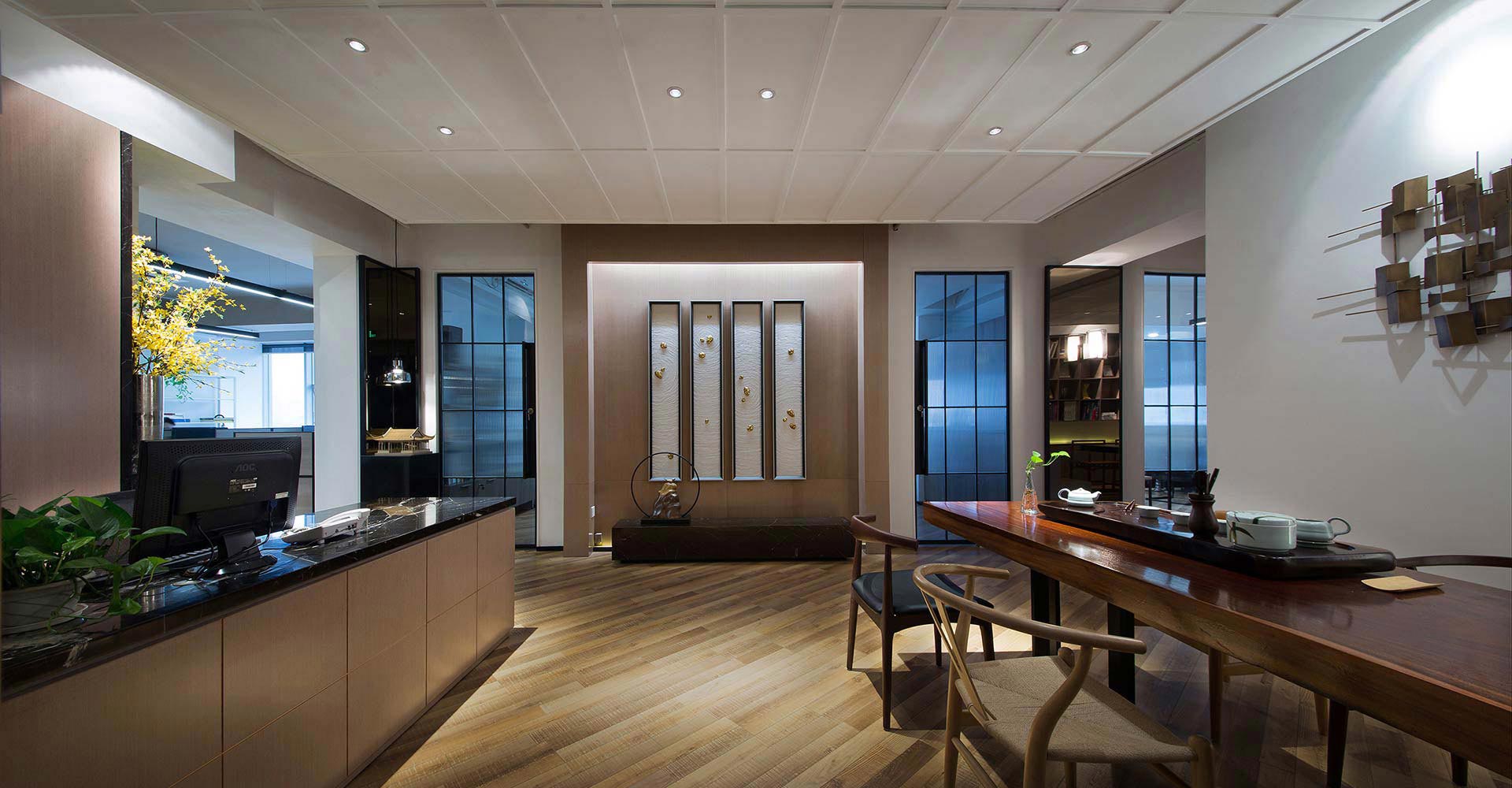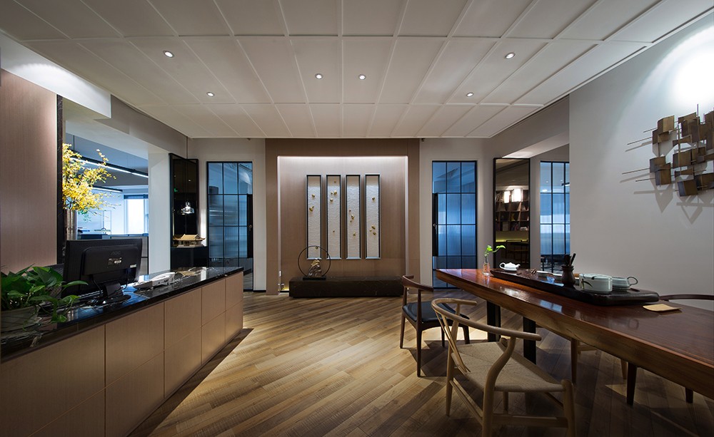 辦公室前廳設(shè)計(jì)整體給人的感覺是:簡單、輕靈、悠然,彰顯出一種內(nèi)秀之美。前廳裝飾墻上懸掛著一組新中式掛畫,掛畫下面的銅制鐵環(huán)擺飾與掛畫融為一體,別具一番韻味。前廳左側(cè)為前臺辦公區(qū),右側(cè)為客戶接待品茶區(qū),該區(qū)配有質(zhì)地精良的茶桌茶椅,靜謐的空氣,樸實(shí)的茶具,古典雅致的中式燈具,頗有“一花一世界,一葉一如來”的禪味。