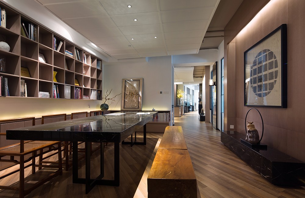 會議桌右側(cè)的木格架上擺放的大量書籍以及獎(jiǎng)杯、飾品,在上方燈光的輝映下,顯得寧靜優(yōu)雅,眾多木質(zhì)方格的排列組合增添了空間的立體感與豐富性。會議桌左側(cè)墻面上掛有一幅寬大的中式畫,簡單的幾何圖形,黑白相間的色彩,于簡單中蘊(yùn)含著無限的意味。緊張工作之余,公司員工可以在這里品嘗一杯咖啡,翻幾頁書,享受輕松怡然的心靈小憩。