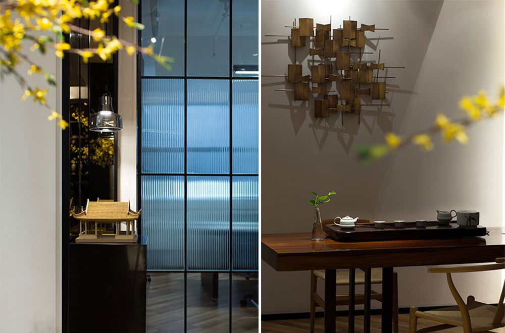 從前廳左側(cè)進(jìn)入公共辦公區(qū),過道邊一株盆景正粲然綻放著一簇簇細(xì)碎黃花,經(jīng)燈光照射,在原木色地板上投下一地斑駁花影,給人清幽之感。公共辦公室設(shè)計(jì)以白色為主調(diào),整體顯得簡潔明朗、和諧自然,具有靈動(dòng)而清澈的氣韻。半透的工業(yè)風(fēng)玻璃隔墻,未經(jīng)裝飾的天花,讓空間顯得更為開闊大方。辦公家具亦極盡簡約,淺灰色辦公桌,白色鐵質(zhì)書架,再搭配幾處隨意點(diǎn)綴的的清新綠植,整個(gè)空間顯得富有生機(jī)和活力。墻面上的幾幅新中式掛畫,為整個(gè)空間增添了幾許雅致的中式韻味。