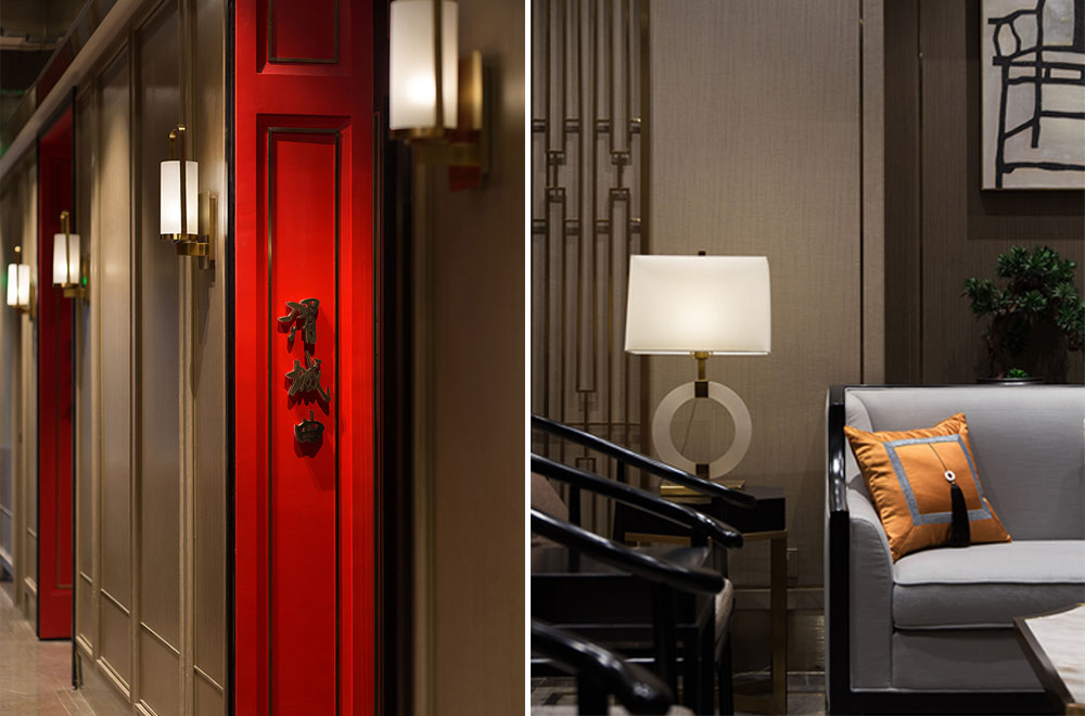 餐廳以一種做客式的空間形成方式,將顧客引入極致韻味的用餐氛圍中。喜粵薈餐廳設計將優雅與舒適融為一身,個性化定制的家具與室內陳列的中國水墨畫作,皆為包房內增添了東方色彩。設計師用隱喻的手法將具有中國特色元素的掛畫、燈籠、水墨畫等融入整個設計中,讓人不經意間就能發現隱匿于空間中的東方情懷;再次,運用精美的裝飾品以及新中式燈飾,營造出高雅的藝術氛圍。最后,紅色材料在空間靈活跳躍著,一改暖灰色調中安靜沉穩的模樣,使空間流溢著喜慶,也讓喜粵薈餐廳增添一份靈動,采用柔和的暖光源,使空間變的通透而開闊,溫和而舒適。 在這里用餐,食客會被濃烈而又愜意氛圍所感染,猶如置身于一幅東方色彩的畫卷中,連每一道菜都成了藝術品。