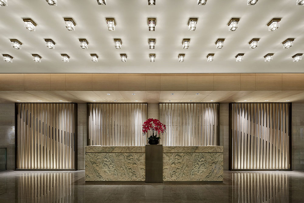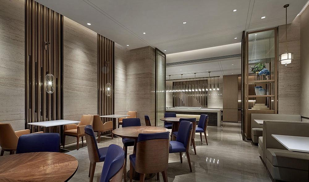 借由線條色塊,朗昇以室內天花的高低錯落和立面的不同材質體塊作為隔斷完成對空間的限定,巧妙的將大堂、公共就餐區、包房、高管區進行了有效劃分,整體空間互相連結卻又彼此獨立。區域分隔和聯系的交替、高低錯落的變化,不僅彰顯空間關系的轉換,平衡了餐廳私密與開放的本質需求,也是對中國以倫理次序為依托的“禮”的最高致意。
