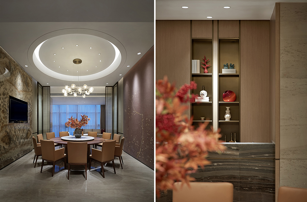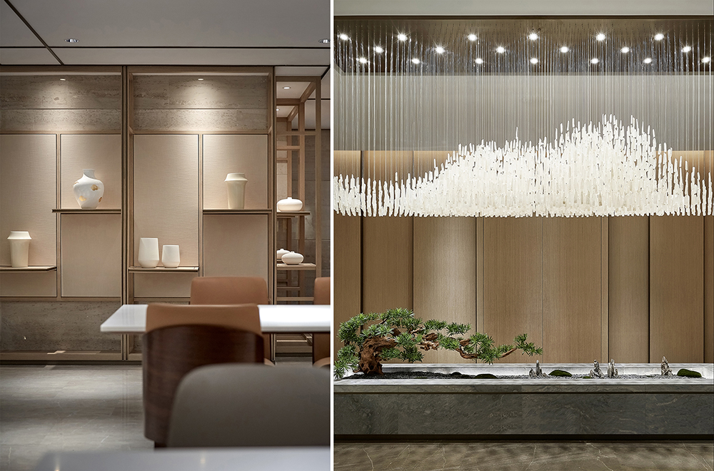 中式文化與自然萬物的當代表達,把設計做出不可替代的質感,不浮、不俗、不枯、不寡,朗昇強調精英品位的同時,讓餐廳設計回歸到對人對餐飲空間的本質訴求上。這里不再是刻板的功能空間,而是納氣凝神的載體,是天、地、人、文之間微妙與隱秘的平衡。