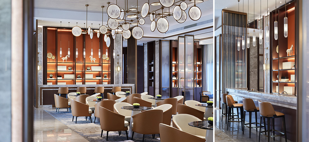 本項目建筑高度與標準化層高有所差異,因此天花高度做了整體抬高處理,以岳麓書院為意向靈感的藝術(shù)水晶吊燈點綴整個空間,增加層次感的同時與兩側(cè)桐木結(jié)合的屏風(fēng)形成呼映,虛實之間弱化空間局限。