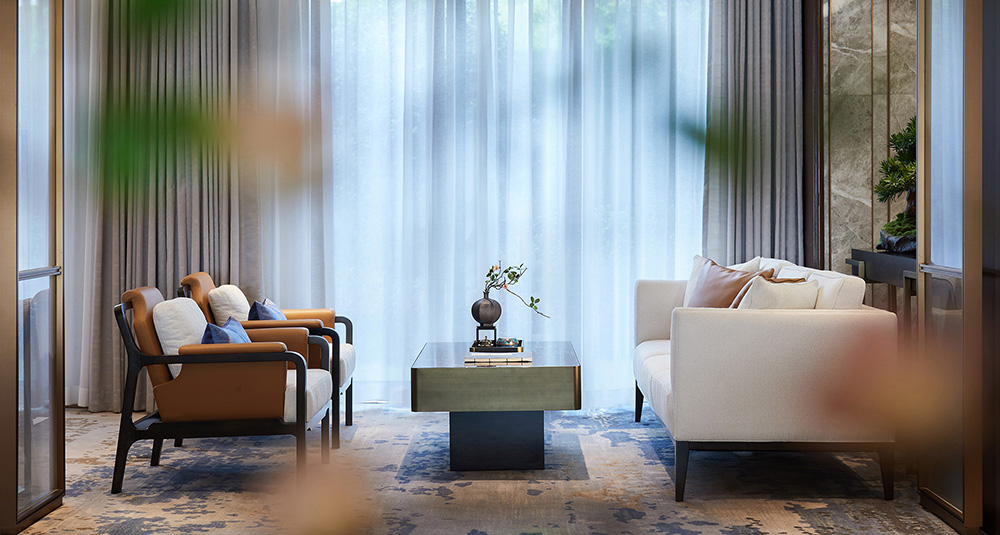 以商業(yè)展示、洽談交流為使用目的而存在的銷售中心,除了對居住概念的藝術(shù)性傳遞還需要滿足商務(wù)需求,所以空間實用性是我們打造整體意境時的重要參考。本案由于項目本身的結(jié)構(gòu)限制,在前廳和大堂處通過許多細節(jié)的處理增加了空間的層次感,以保證整個銷售中心接待動線的流暢性。