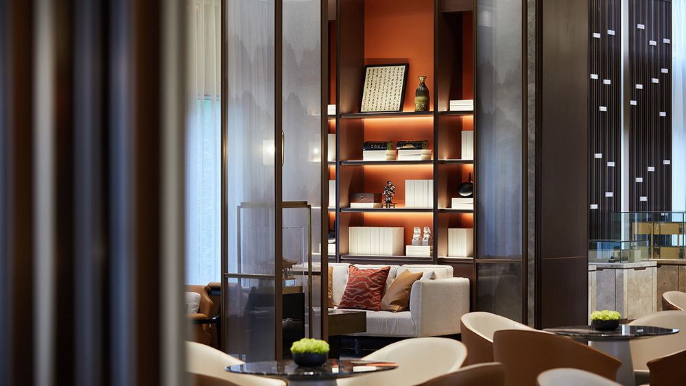 從前廳延續(xù)至洽談區(qū)的屏風(fēng)貫穿整個空間,沒有太多元素的堆砌,依然以層次感結(jié)合城市印象作為洽談區(qū)的氛圍營造,以灰色為空間基調(diào),融入時尚橙紅色并加入金屬成分,提升品質(zhì)感的同時將古典意境流動在洽談空間中。