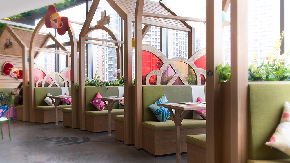 Hello Kitty Secret Path餐廳(佳華領匯廣場店),將植物元素進行篩選、提煉、重組,希望將空間打造成一個佳體驗感佳同時又能緊扣品牌文化的主題餐廳,一面傳達視覺上的年輕的朝氣,一面表達向大自然致敬。從“童年”的視角和感官出發,不只是為兒童,更是為現代成年人創造豐富童趣體驗的“親子花園”!
