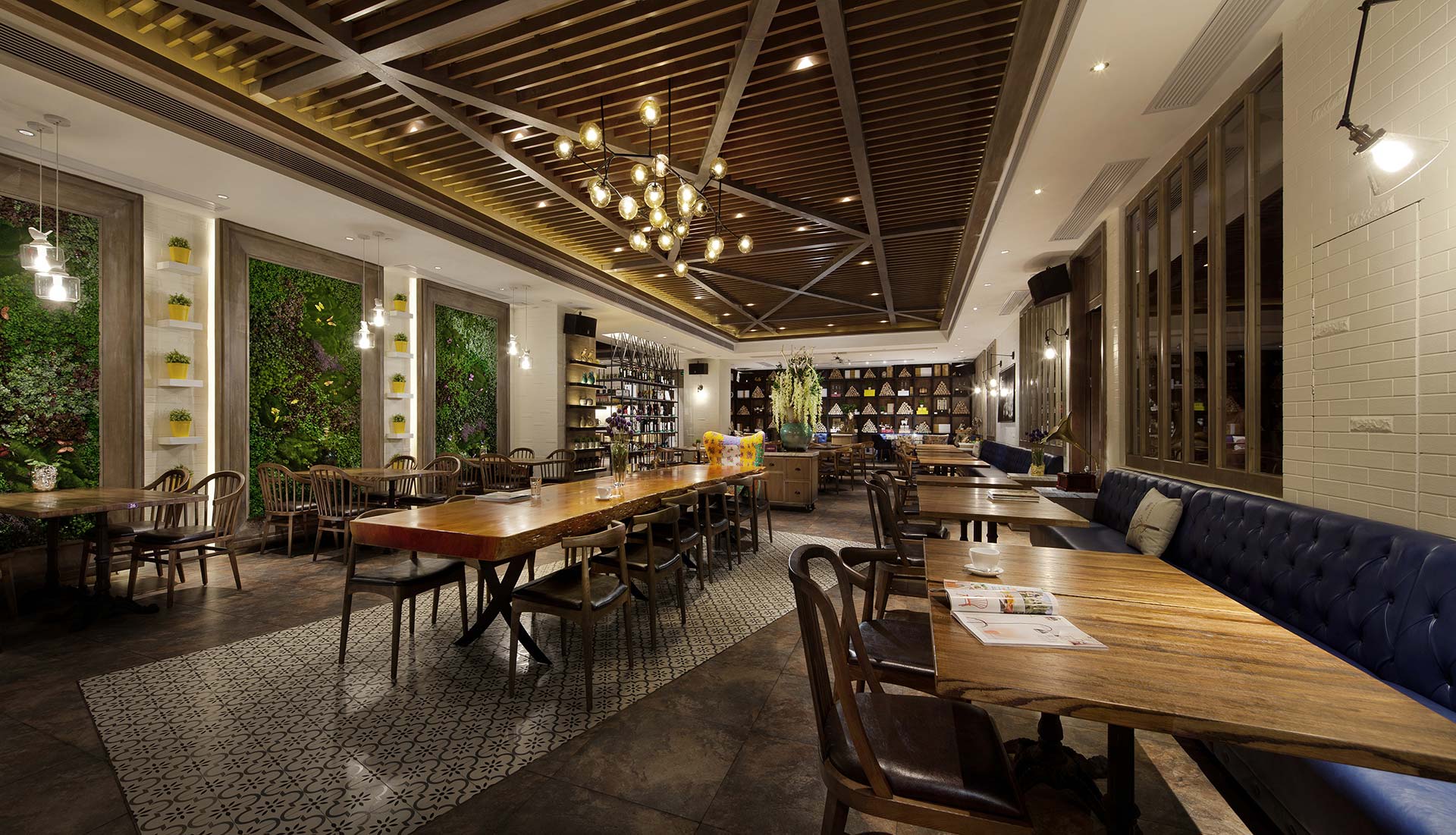 就餐區分為大廳、卡座和包房三種類型,而廚房操作區位于整個就餐區的中間區域,干凈明亮、清潔衛生的操作環境,使客人可以完全放心就餐。大廳設計整體空間感明快大方,潔白的墻磚、生機勃勃的植物墻、格柵天花以及地面的復古磚和小花磚等不同材質運用以構造出歐陸復古風情的基調,而擺放在不同區域的裝飾如充滿童真粉筆畫小黑板、古舊的唱片機鳥籠燈、整塊原木製作的長條桌椅等,則強化了空間中隨性自然、復古懷舊的氣息。