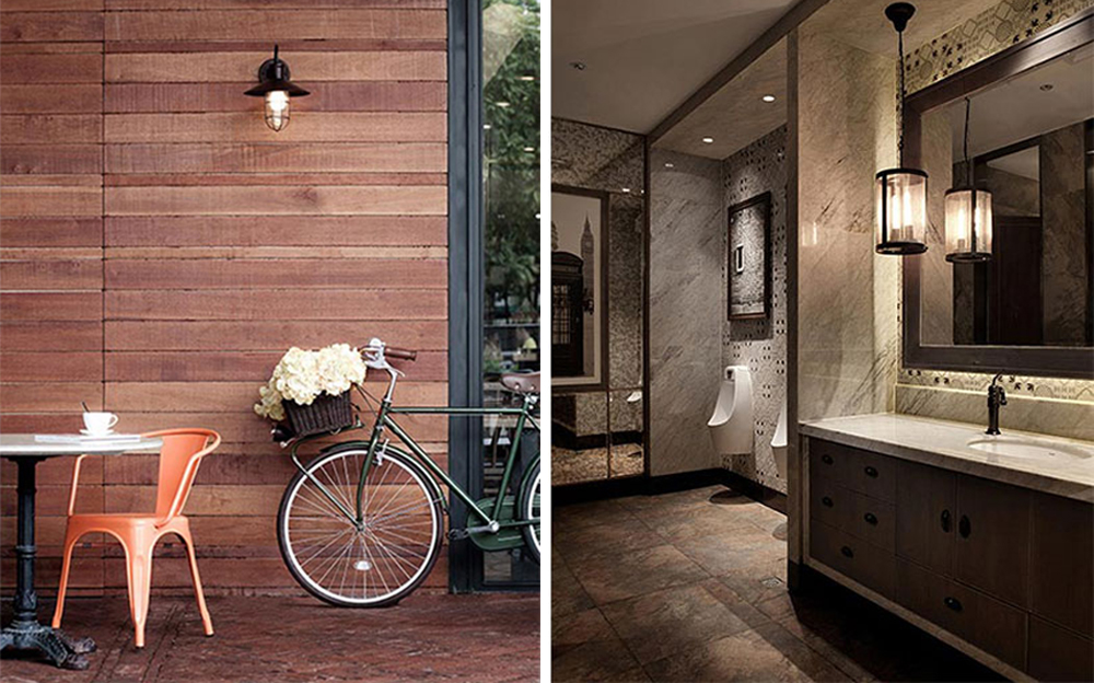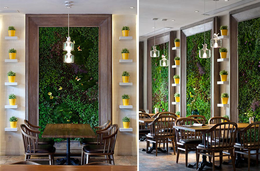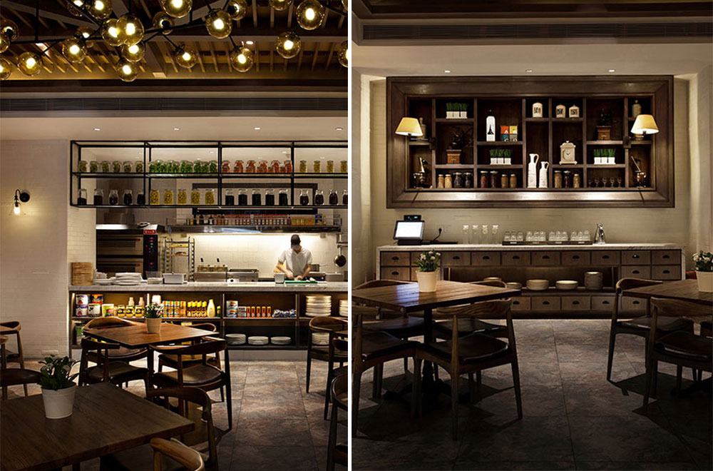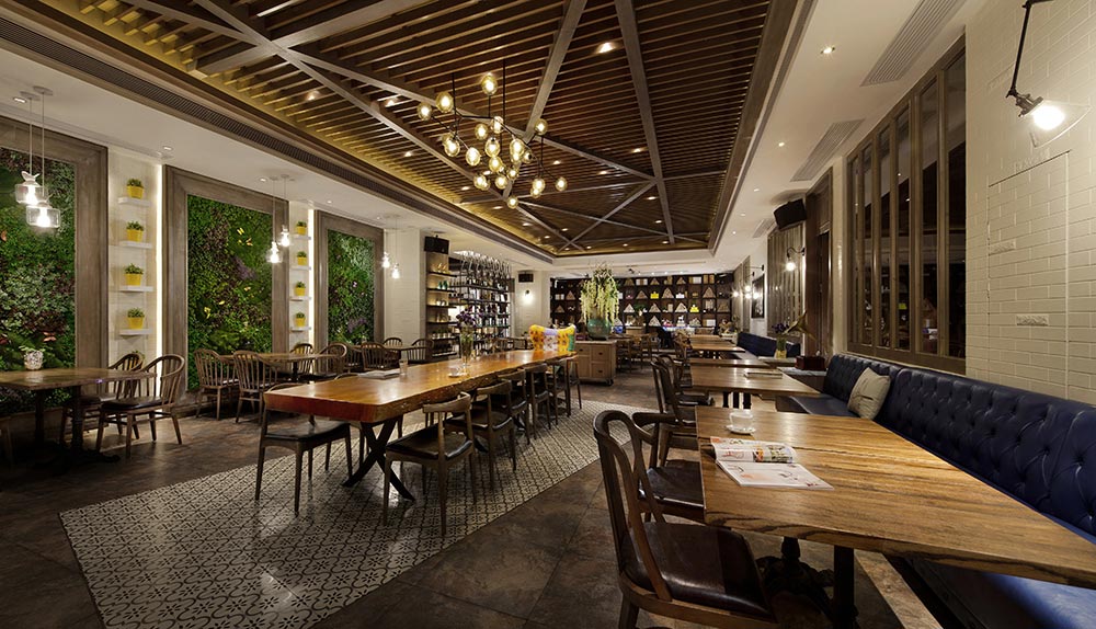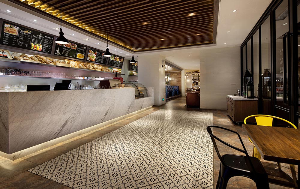 進入餐廳之前通過的花園餐廳,歐陸風情的藤藝桌椅,綠意盎然的木架藤蔓,以及隨意擺放的自行車、燈具等,讓人即刻享受到無限輕松自然的休閑感覺。點餐區簡潔明亮、現代大方,以體現輕食主義自然、健康的特點,但地面鋪貼的小花磚以及隨意擺放的椅柜及燈飾等,卻使現代風格中閃爍著絲絲復古氣息。