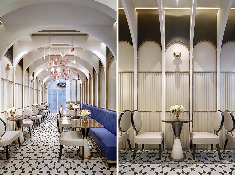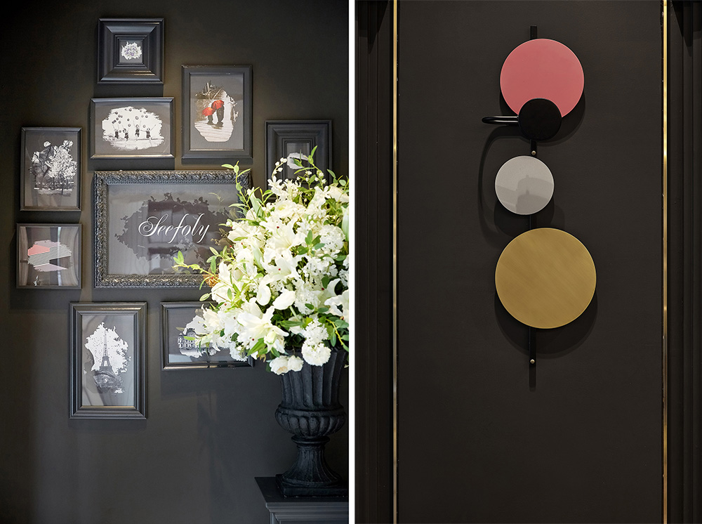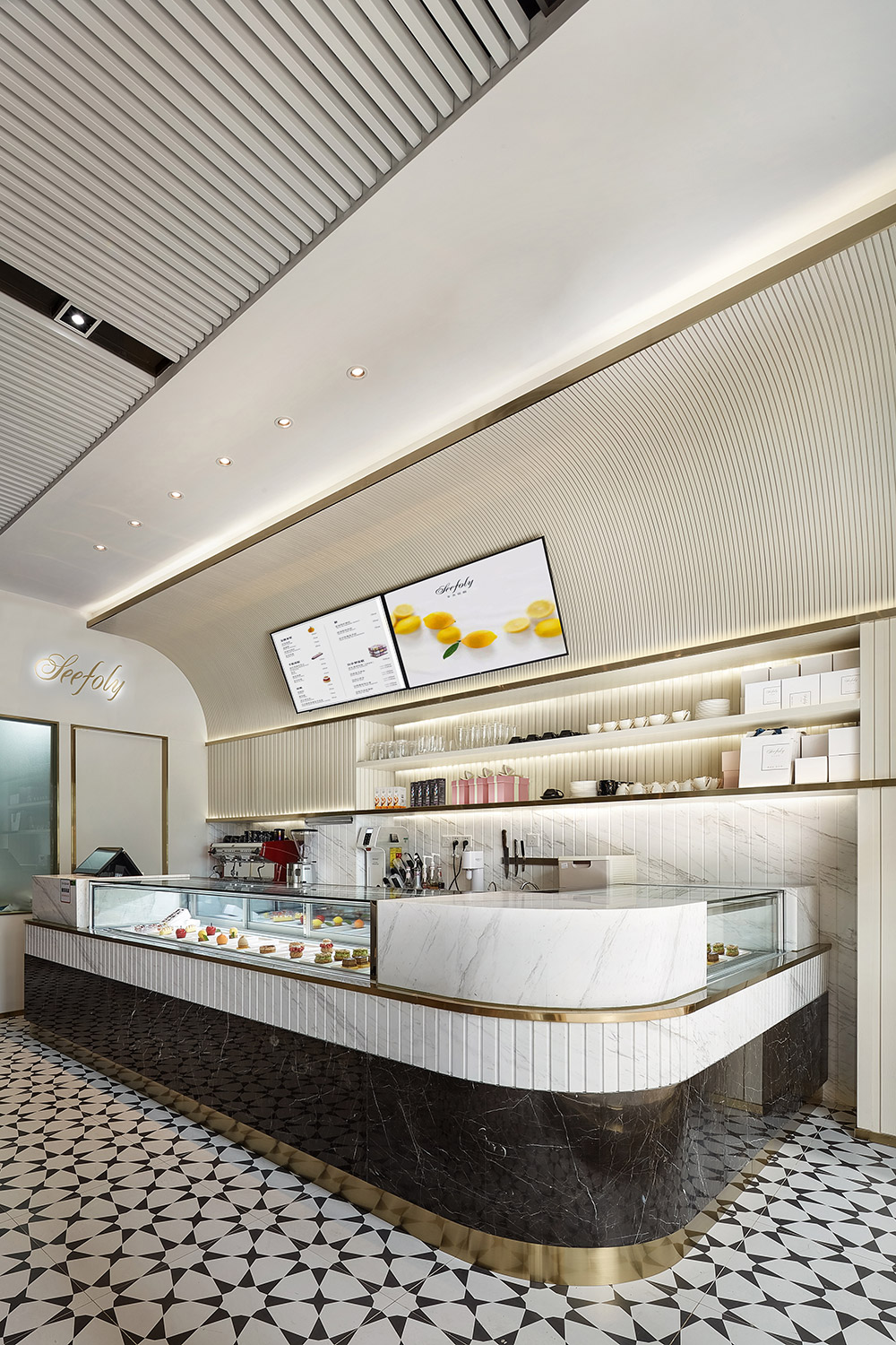 法式輕奢既是莘芙麗咖品牌的調性也是主創設計師賦予空間的氣質,設計師將seefoly三位合伙人對法式甜品文化的熱愛完全融入在空間里,讓來到這里的每一名體驗者,在品嘗法式甜品的同時真正享受屬于自己的浪漫時光,以一份精致甜品點綴忙碌生活。