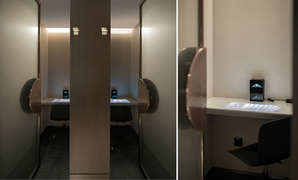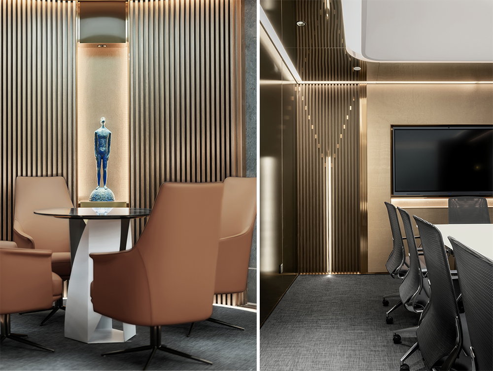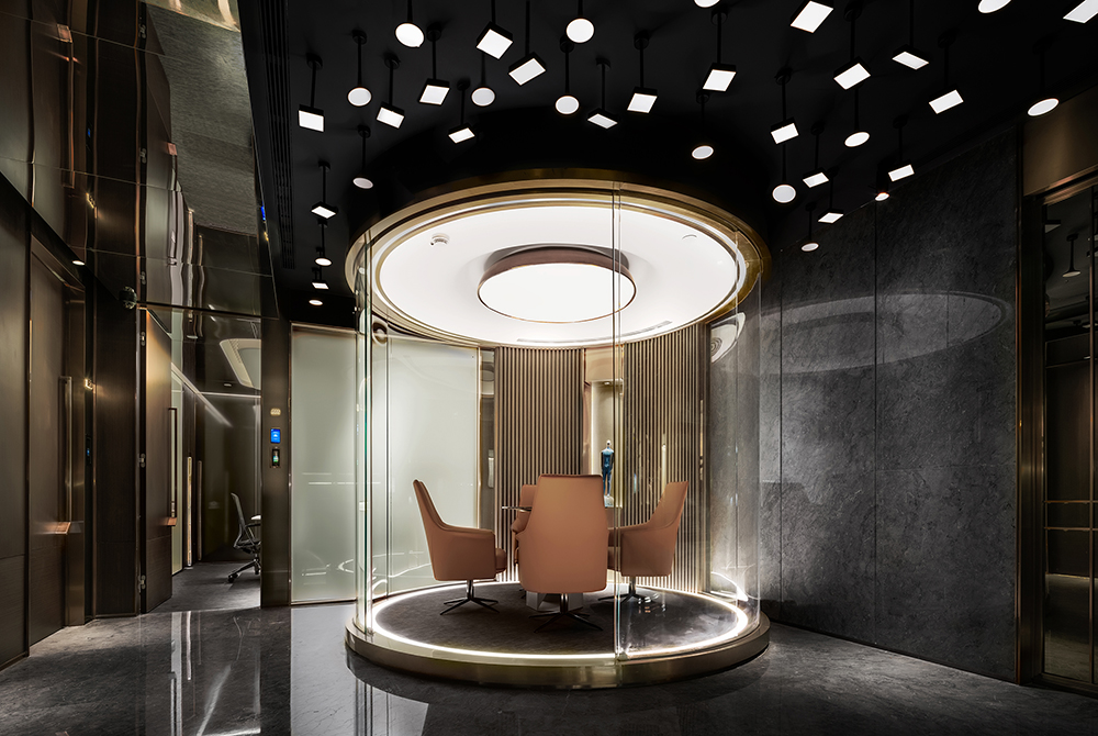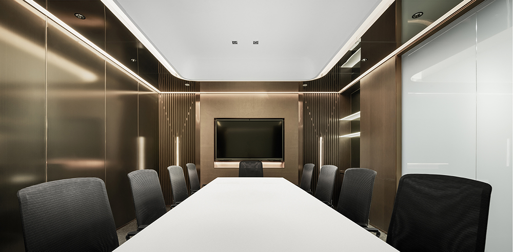 前廳空間意念由接待臺LOGO標識的水、木之形開始,延伸至水波紋形狀的石材背景墻,頂面寓意星空未來感的燈飾點綴在智慧城市的暢想中,共同構筑一個融于自然的人性化科技美學空間。