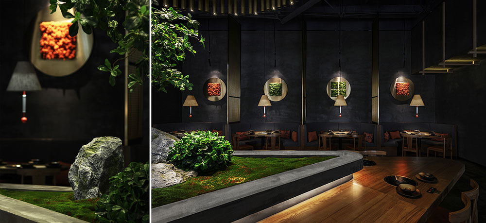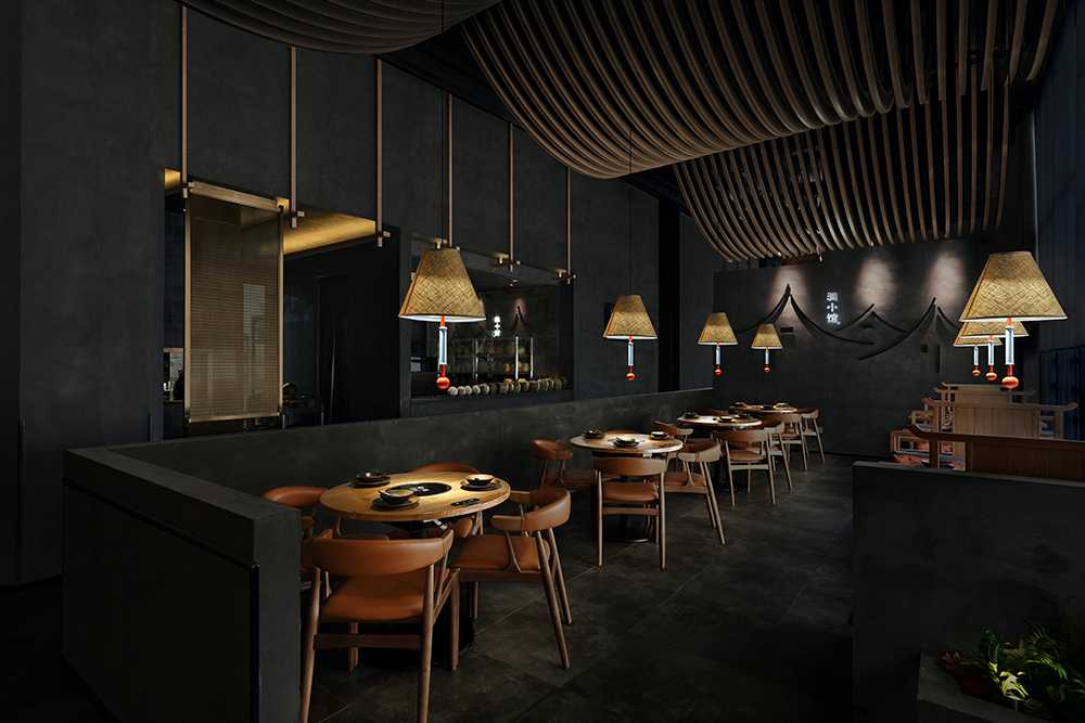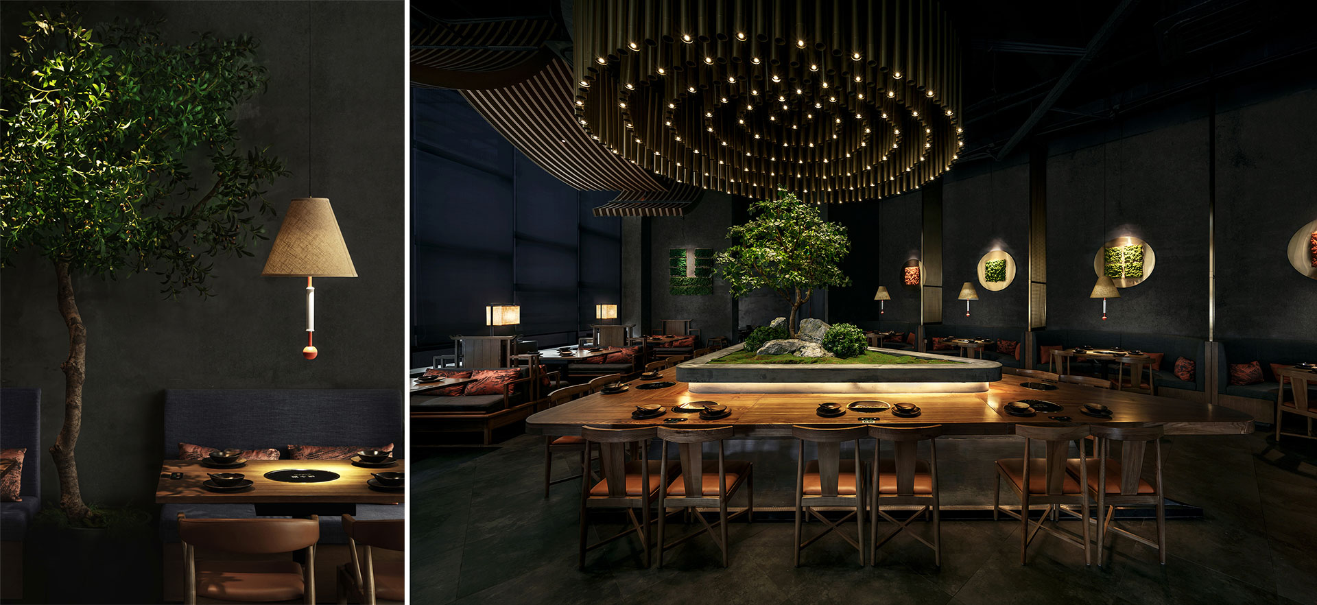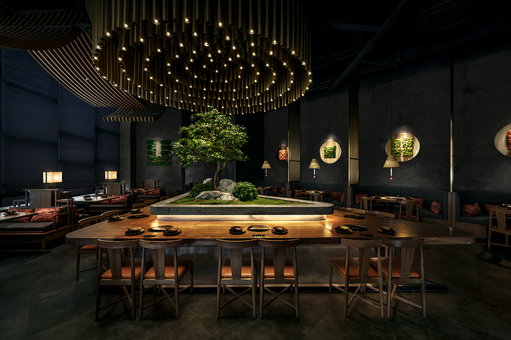 初始亦為回歸的禪意落筆在公共空間動線的終點,我們用完滿和圓融的形狀喻意生活的來時與歸處,場景上方宛若星系的圓形燈飾,是大自然“天時、地氣、順風”之意所向,美食與設計都是生活的藝術,來源于生活的點滴升華為精神世界的向往,以此為感悟,在空間中傳遞寧靜致遠的心靈意境。