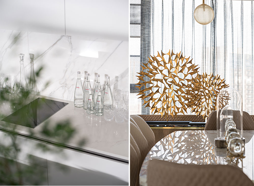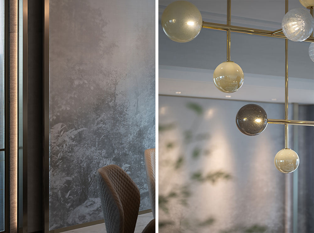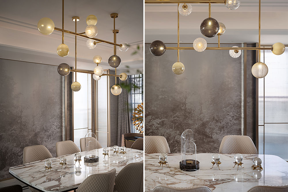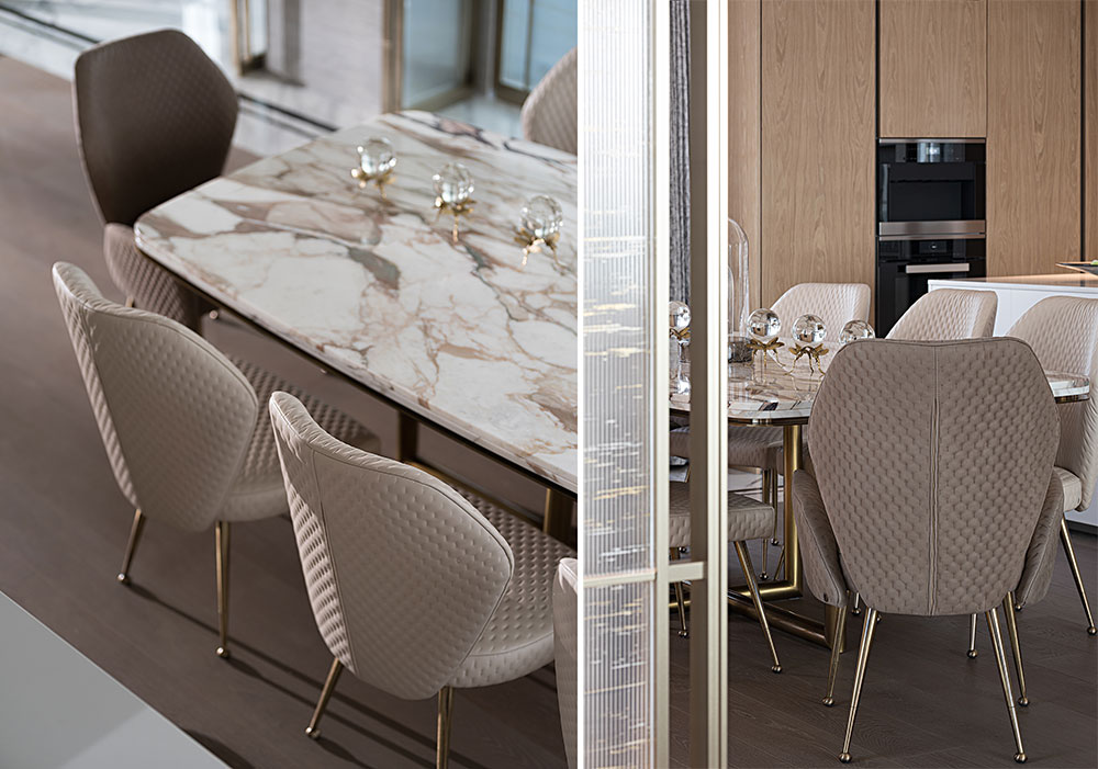 餐廳背景的阿瑪尼墻布是設(shè)計靈感最初的空間映界,也是自然元素與品質(zhì)生活的對話,我們用它解讀業(yè)主的生活格調(diào),也印證自然元素的時尚質(zhì)感。