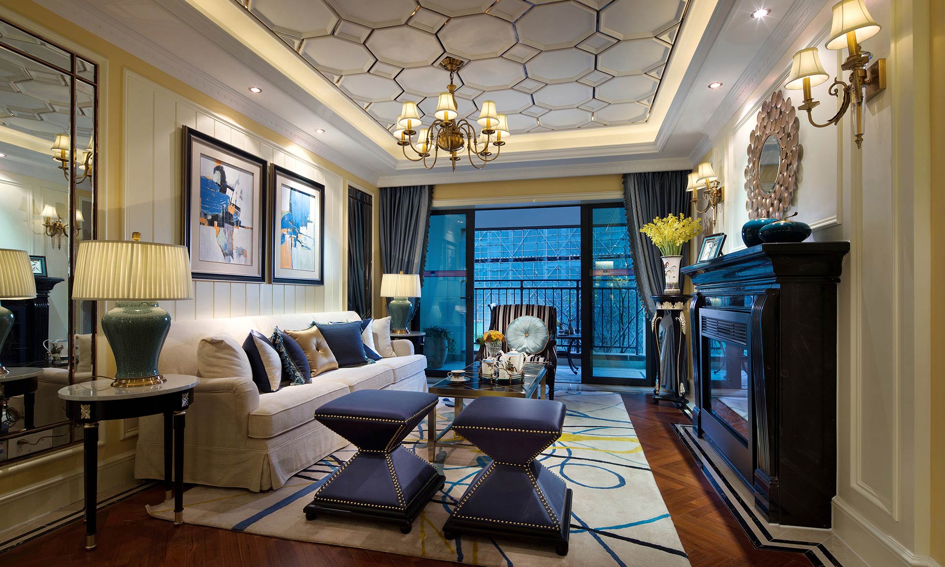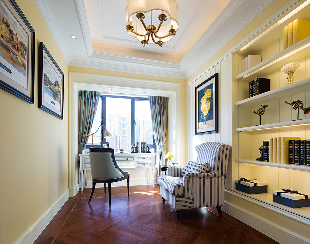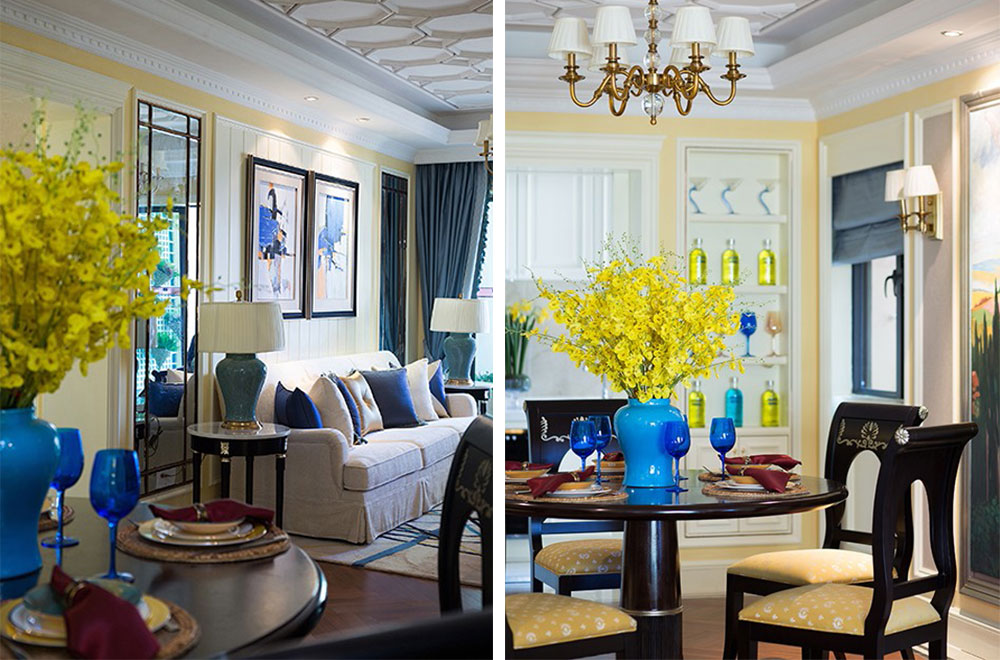 本套樣板房設計以歐式田園風格設計為主,與現(xiàn)代元素相結合,并輔以少量東方元素作為點綴,整體空間以藍、黃色作為色彩基調,使用優(yōu)雅的黑、白色中和,浪漫的歐式經典藍、黃色絲質布藝與抽象紋樣地毯、掛畫、燈具相搭配,營造了精致細膩而又自由浪漫的空間格調,呈現(xiàn)出充滿自然氣息的田園風情。