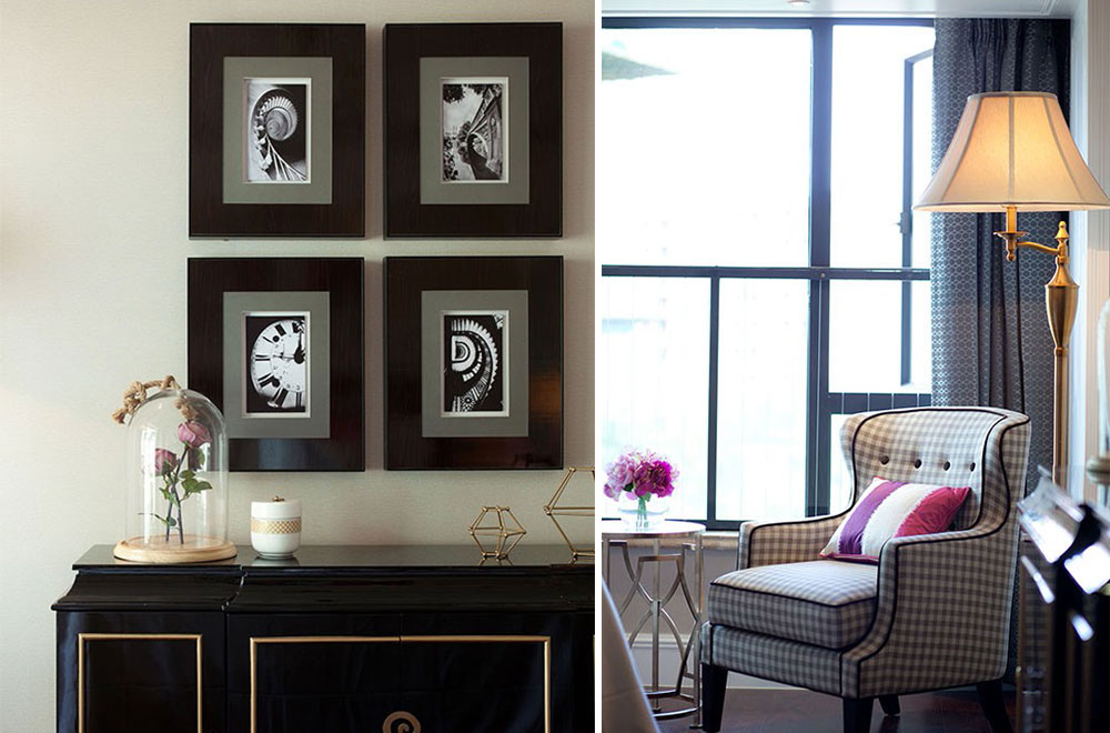 主臥設計帶有懷舊氣息,又不失時尚現代感。米色的墻紙讓人倍感溫馨,以金色線條裝飾的復古黑柜呈現出一派沉穩的貴氣,墻上的黑白組合相框裝飾,讓人想起上世紀美國電影的黃金時代,黑白相間的搭配是永不過時的潮流。床后的風景畫中是大片盛放的簕杜鵑,與床上的抱枕及粉色的臺燈相互呼應,凸顯了女性溫柔優雅的一面。大大的落地窗前,恰到好處地擺放有一個黑白格的復古沙發,其后佇立著一個優雅的罩燈,若是伴著窗外美好景致,窩在沙發里讀上一本小說,定是一種極致的幸福。