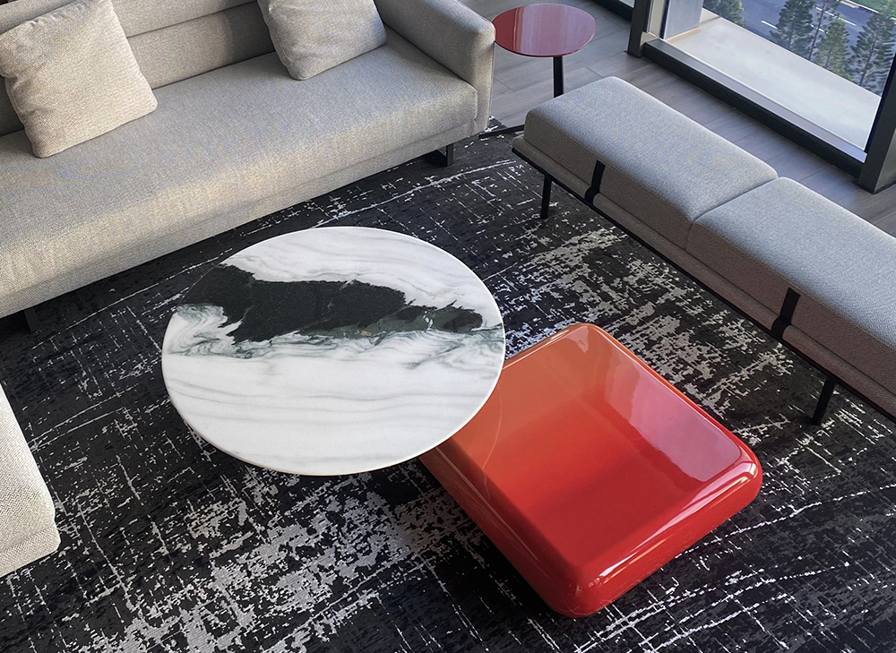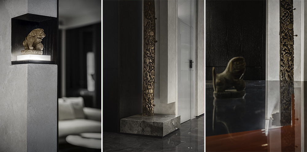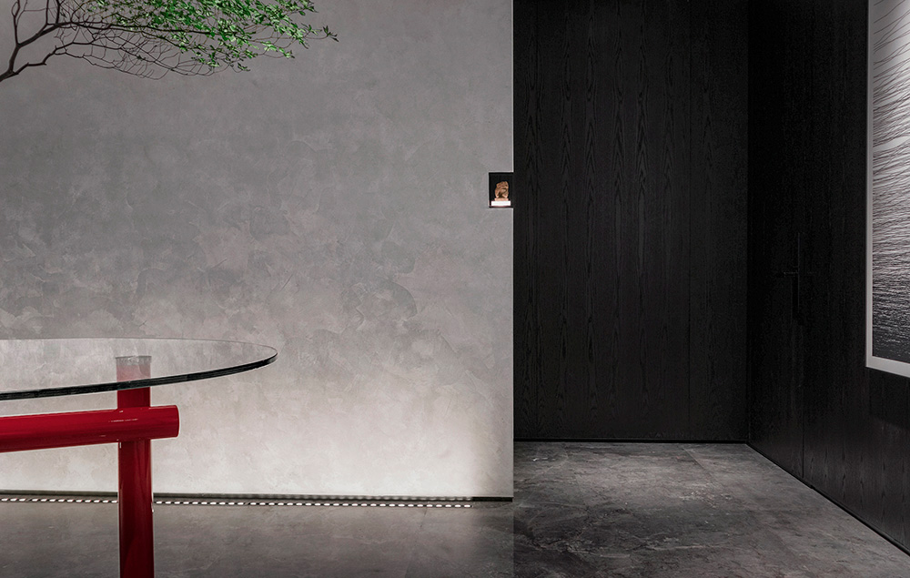 公共區域簡單擺放某個空間記憶里的石凳,大理石裝飾臺上意外出現的山石與翠綠,長廊盡頭畫面上靜止的海從另一個角度看迎面卻是熱情似火的紅色。喜歡的裝飾就那么隨性安置于某個空余的位置,奇妙的是,空間并沒有因此被填滿,反而出奇地和諧并趨于平靜。