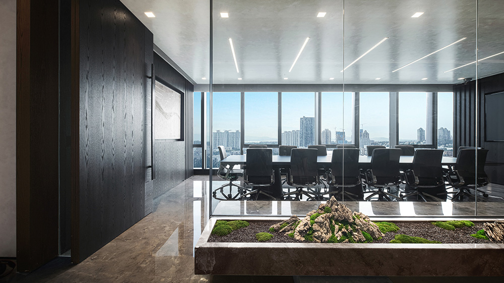 于是我們會看到黑白灰的現代空間里有木雕、中國紅等東方元素,大理石裝飾臺上出乎意料的山石翠綠,東方文化是我們的藝術啟蒙,是刻在骨子里的基因,無論時代帶給我們多少新的血液,我們都不能完全變成另一個自己。具有東方文化基調的現代空間,是朗昇這幾年所思考的設計觀念,并且在新辦公空間里得到更加真實的認證。