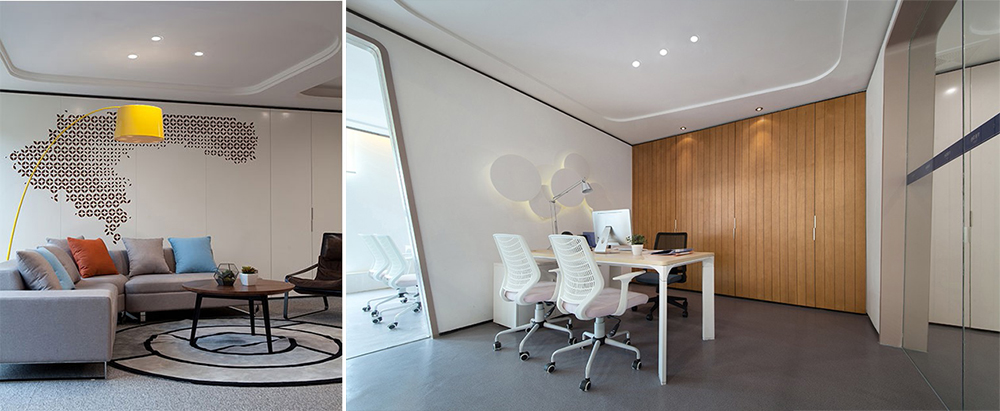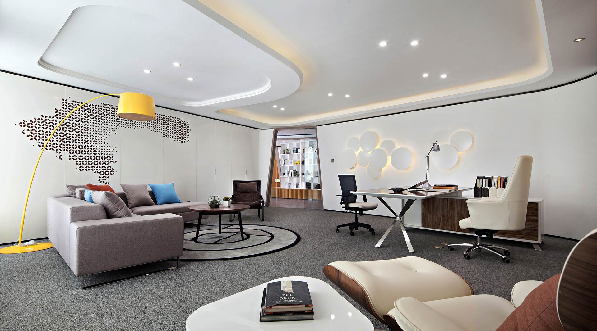 從前廳到總經(jīng)理辦公室,異形門與流動曲線的不斷出現(xiàn),充滿著動感和趣味,使人如同置身在一個(gè)動態(tài)的異形空間里。素凈的白色,簡雅而高品質(zhì)的家具,讓總經(jīng)理辦公室顯現(xiàn)出一種干凈利落之美。圓形的黑白色地毯就像一幅太極八卦圖,將乾坤萬物玩轉(zhuǎn)于掌心。與地毯相對的是變異的方形天花設(shè)計(jì),扭轉(zhuǎn)了古人“天圓地方”的思想,彰顯出一種顛覆與革新的精神。鮮黃色的落地?zé)魹檎麄€(gè)凈白空間注入了一抹亮色,增添了幾分艷麗與雅趣,讓剛與柔、力與美在此處盡情釋放。