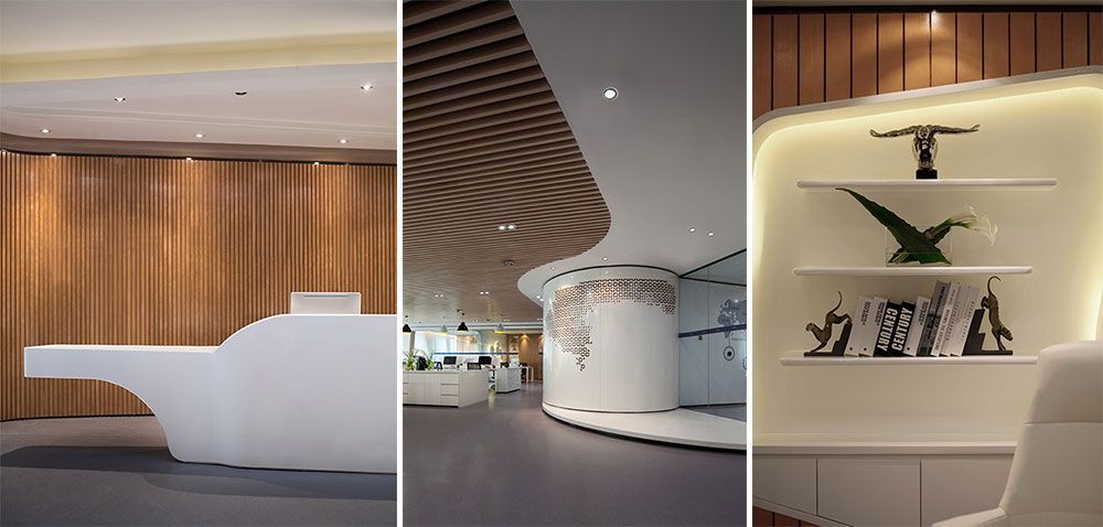 流線型的有機(jī)形態(tài)、簡潔素雅的色調(diào)、造型獨(dú)特的桌椅,甫一開始,前廳設(shè)計(jì)就奠定了整個(gè)辦公空間設(shè)計(jì)的基調(diào),給人簡約靈動、時(shí)尚大氣的整體感受。流體曲線結(jié)構(gòu)的接待臺以象牙白作為色調(diào),皎潔如玉,純凈雅致,配以前臺人員的笑容,使人如沐春風(fēng)。接待臺后側(cè)豎條狀的木質(zhì)裝飾墻,宛若一排整齊的琴鍵,彈奏著氣勢恢宏的交響曲,又似一卷綿長的書卷,正展開新的篇章。右側(cè)是訪客接待區(qū),一組特別配置的純色U形布藝沙發(fā),溫柔了每一縷風(fēng)塵,給人輕松愜意之感。